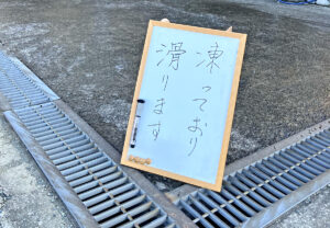 日蓮宗では毎年11月から2月にかけて荒行(100日行)が行われています。 伊勢原法眼寺ご住職様は、修行に入られている方々が何事もなく無事に達成する事ができるようにと 毎朝6時前に本堂前にてお水をかぶっておられます。 結果本堂前が水浸しになり、それが寒さで凍ってしまうため、こんな看板を置いているのです。 今年もあと少し、修行に入られてる皆様が無事達成されますようお祈りしております。 伊勢原樹木葬墓地のページはこちら→