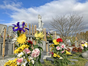 たくさんの方がお参りにお越しくださっています。その中でお供えいただいたあやめが、凛と美しく咲いています。 花言葉は「信頼」「希望」。 手を合わせる時間とともに、境内はあたたかな祈りに包まれています。 心花(このか)の里樹木葬墓地のページはこちら→