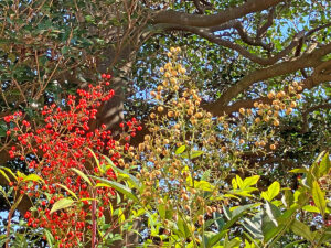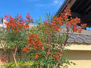 真光寺の境内では、赤と白の南天の実がたくさん色づき、今年は例年以上に豊作です。